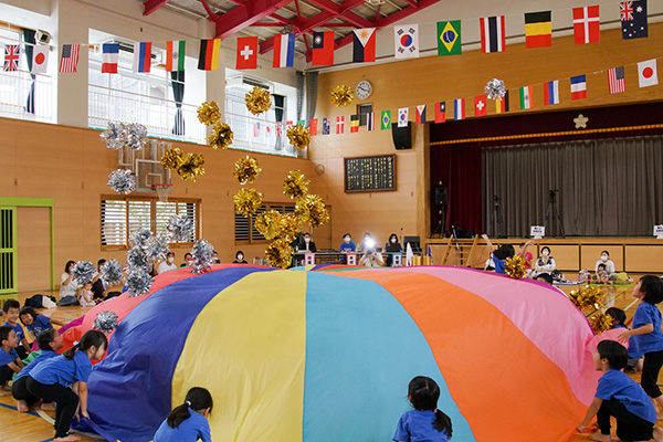 近隣の小学校の体育館を利用して、みんなワクワク運動会!力を合わせて頑張るぞー♪