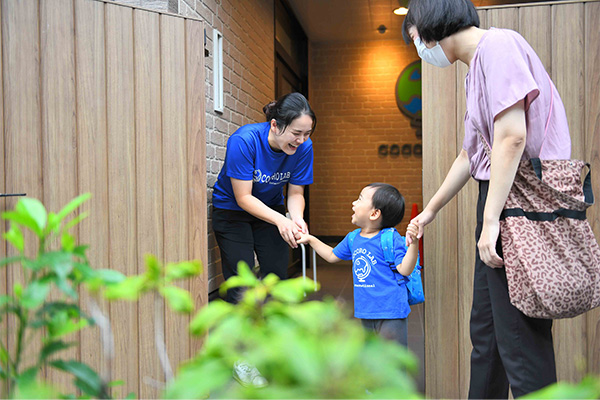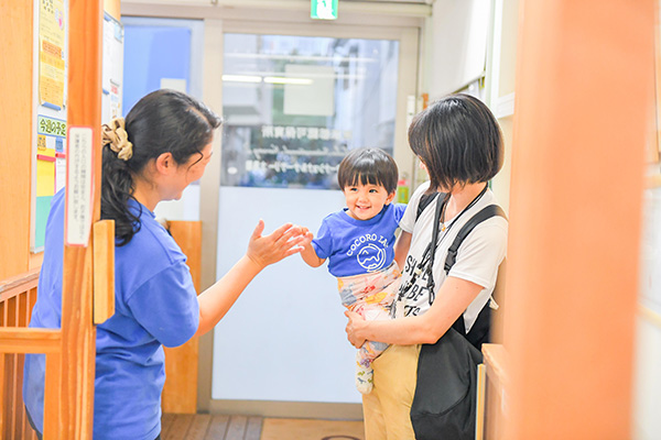「おはようございます」の元気なあいさつととも今日も元気に登園です。※ 園により開所時間は異なります。