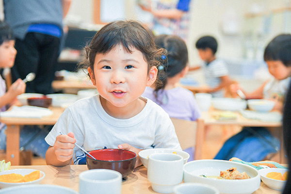 園内調理の作りたて給食♪ 栄養バランスはもちろん、季節感、日本各地の郷土料理、世界の家庭料理など、日々の給食を通じて、子どもたちが様々な体験ができるような食育を大切にしています!